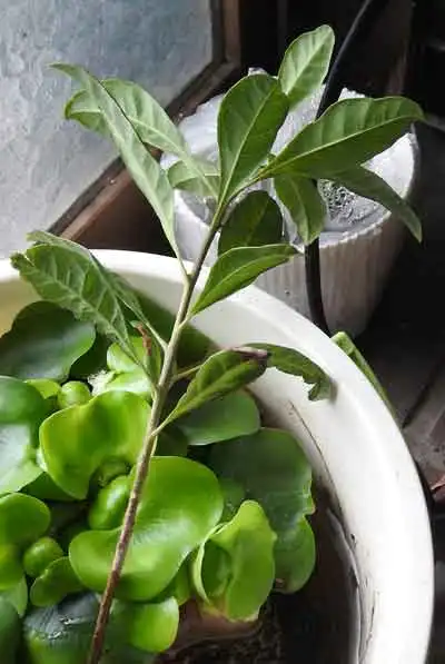 写真の様に変わらずです、水に浸かっている茎の部分の吹き出物のようなものは茶色に変色したまま変わっていません。バケツにヤマモモ1枝では寂しいので殖えすぎたホテイアオイを入れました。本当はホテイアオイが殖え過ぎて。ついでにホテイアオイの冬越しの実験中です