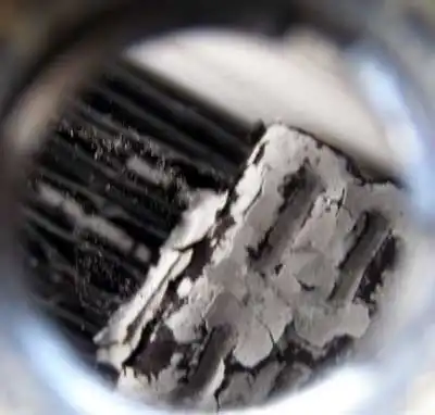 実験用にエンジンが始動出来る状態の鉛バッテリーを2個使っていますが、 電解槽6個の半分ぐらいの槽に硫酸鉛の結晶(サルフェーション)が付着しています。