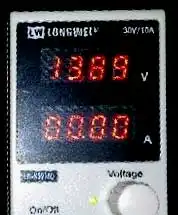 - 左側下の[ On/Off ]ボタンを押します。すると、LED表示の上段の電圧と下段の電流が全桁表示されます。