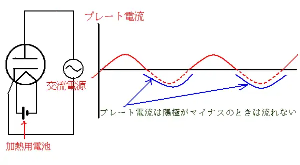 2極真空管の一番大事な性質(陽極にプラス電圧がかかったときに電流が通じる)は、交流の整流(検波)に使えます。