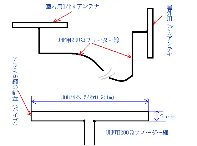 使い方は、1/2λアンテナを二つ作り、UHFテレビ用200Ωフィーダー線の両端に接続します。