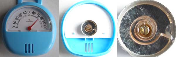 右の写真を見て解るように、湿気によって伸び縮みする物を螺旋状にして、その一端を固定し、他端に針をつけたものです。