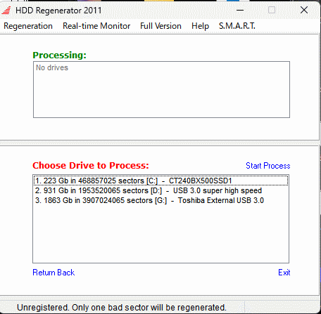 HDD Regenerator2024は、使い方は2011と同じなのですが、未登録では最初の1箇所しか修復出来ないようにもう一段工夫されているようです。2011と同じ方法で次の個所を修復させようとすると、修復はせずにプログラムは終了しません。