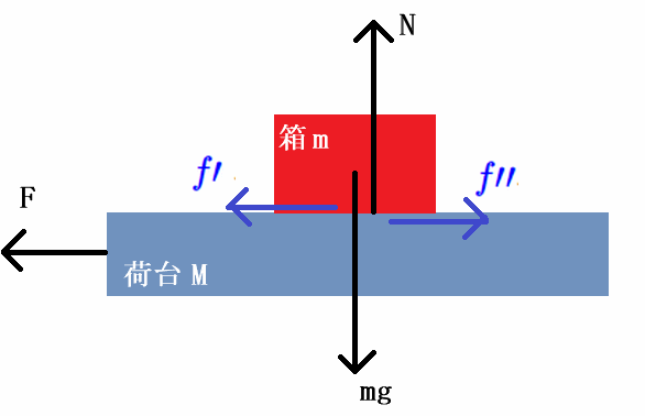 荷台に働く静止摩擦力は荷台の動きを妨げる向きに働くので図の$f\prime\prime$、 箱に働く静止摩擦力は箱が静止しているのを妨げる向きなので図の$f\prime$になります