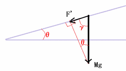 よって、$F'$より大きい$F$で引けば物体は斜面を登り、斜面の角度$θ$が小さいほど$Mg$より小さい力$F$で物体を上げられることになります。